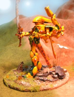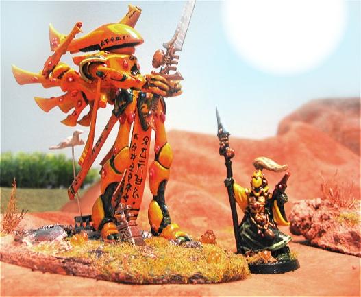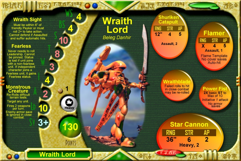 Calentar Eldalon Wraith Lord Beleg Danhir The wraithbone giant stood mute, half-buried in the sands of the destoyed world, waiting for millennia. The rare rain occasionally washed the dusty sand from the giant's contours, and from the hilt of it's never-rusting blade, still clutched as though in mid-attack. It was the last, and it's blow had been the last struck in an ancient war almost lost entirely to memory. Then the call came. Faint, distant, like a whisper over the barren desert, a call sent from afar, but enough to awaken the dreaming soul locked within the sand sunken monstrosity. The creature stirred, and it's hollow armored hands began to methodically dig long buried legs from the sand. Soon heavy tracks led away from where it had once stood. Ancient, artificed, a warrior soul trapped within shaped wraithbone armor, unable to clearly see the world around it, yet it did not stumble. The call was clear. The giant strode proudly, with an ancient confidence born of both power and once living nobility. Finally he stands before the Eldar warlock that called him. Beneath the giant's mammoth feet are the crippled remains of a Necron, the last of an ancient invasion force lost in the sands of time. Beleg Danhir has awakened, at last. The proximity of his returning kindred entered his dreamstate and kindled the warrior spirit within his empty hull to newfound strength.