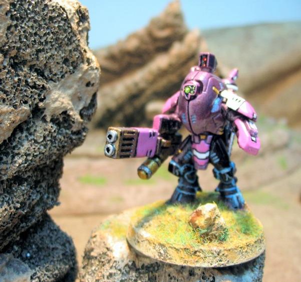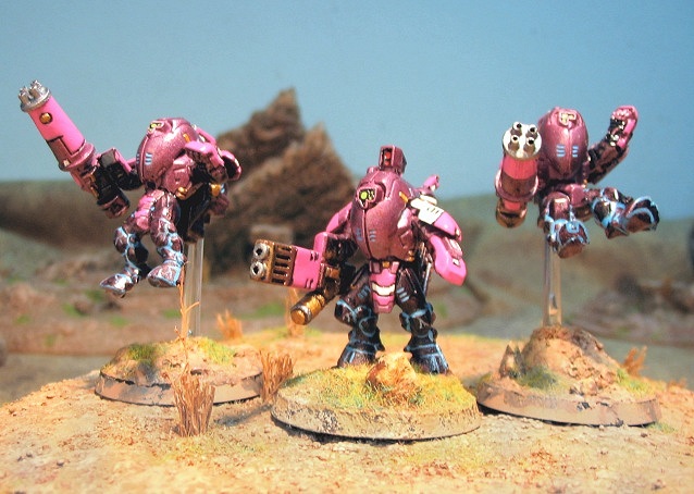 I was unable to get a satisfactory image of all three members of my stealth team, the other two have been mounted in flying -leaping and jumping poses. I liked the effect another painter did with his Stealth team of making the legs show electrical effects to denote the stealth field in action; I imitated the look. I used a spray modelkit paint for the basic finish, which I then detailed with acrylics. I liked the ultra-glossy sheen.