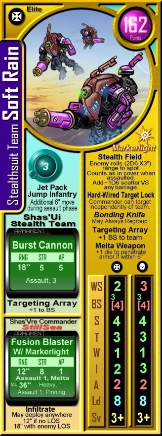 With only three members to the stealth team, adding Bonding was an obvious choice, I think - I don't want the remaining team running off the battlefield in terror if one of them is shot, which invariably happens. Increasing their Ballistic Skill with a Targeting Array also helps; to be useful, they need to hit most of the time, since they serve a valuable purpose. With one burst cannon attack per stealthsuit plus a nice fusion attack for the commander, the stealth team can deliver seven attacks in one turn, one of them Melta. This team can do some damage.